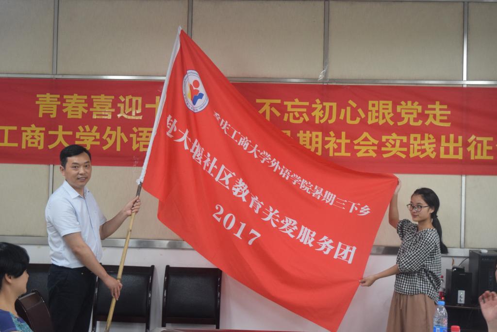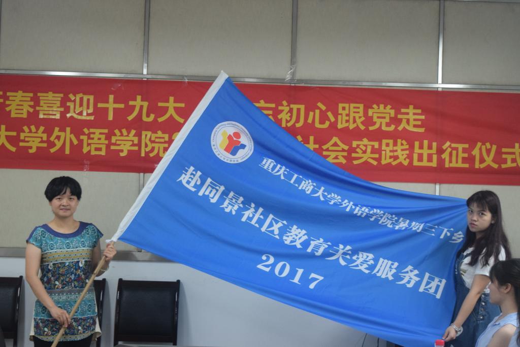 下午4点,出征仪式正式开始。首先黄老师对本次暑期社会实践从课程、宣传、后勤以及安全等方面做了详细的介绍。接着,志愿者代表雷雨佳同学发言,她从本次社会实践的准备、实质、意义等方面进行了阐述,希望志愿者们能够发扬志愿精神,保质保量完成实践任务,同时代表志愿者承诺在实践期间遵守公司统一安排,注意安全。陆书记指出,同学们代表的是外语公司,代表的是388vip太阳集团,代表的是当代老员工,希望大家都能够展现出当代老员工的气质和魄力。陈书记表示这次社会实践对同学们来说是一次难得的锻炼机会,希望志愿者能够发挥团队的力量,相互帮助,保证社会实践的顺利完成,同时也对安全问题进行了强调。出征仪式最后,陈书记和陆书记向外语公司的两只队伍授旗。