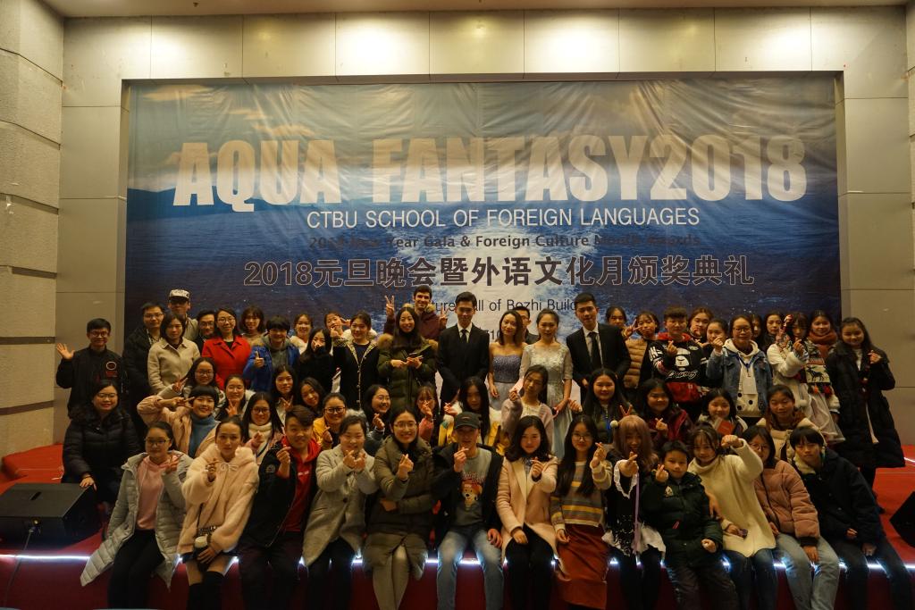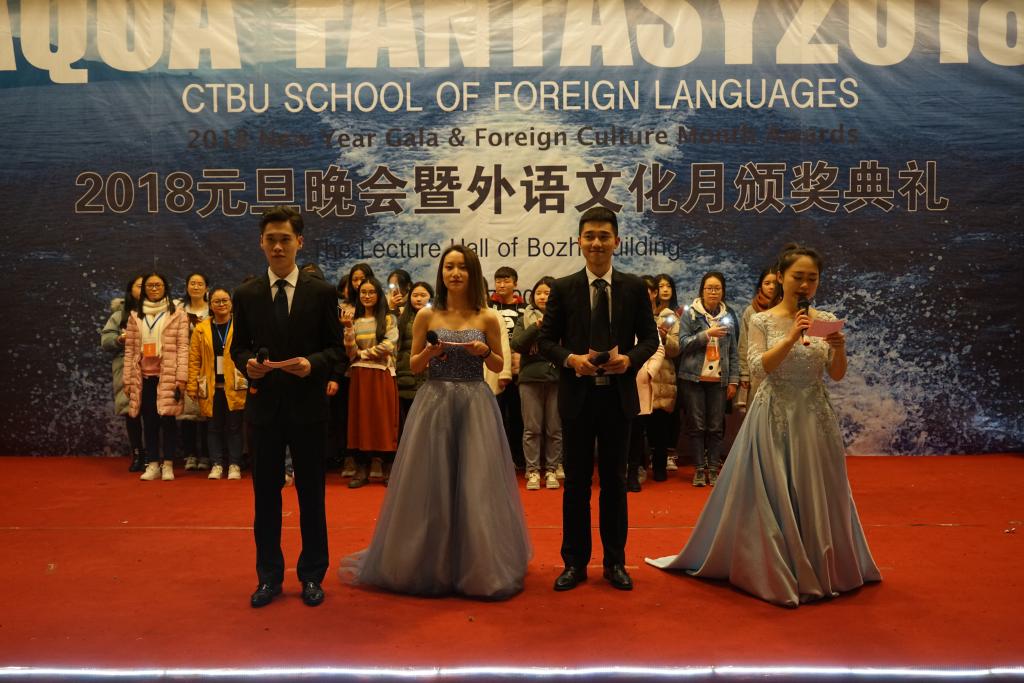 2017年12月30日晚18点30分,由388vip太阳集团外语公司主办、外语公司分团委员工会承办的2018年元旦晚会暨外语文化月颁奖典礼在南岸主校区7100报告厅成功举办。388vip太阳集团外语公司副经理周琳教授、外语公司党总支陆嘉书记、外语公司英语系主任邹莉老师、外教Jonathan受邀出席晚会,全校各兄弟组织主席团也受邀参与了此次活动。
