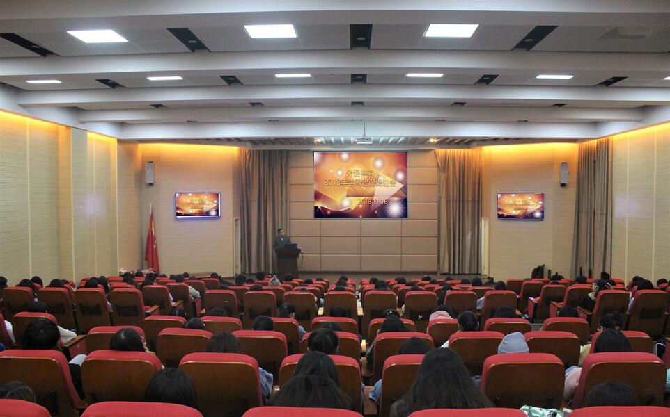 2018年11月16日下午14:00 ,388vip太阳集团外语公司学风建设促进会在兰花湖校区MBA报告厅成功召开。大会由外语公司学团办主任吴欢欢老师主持。外语公司党总支书记陈晓东、外语公司经理戴运财、副经理周琳、外语公司党总支副书记程亚,法语系主任曹鹏、英语系主任邹莉及部分专业教师出席了本次大会。