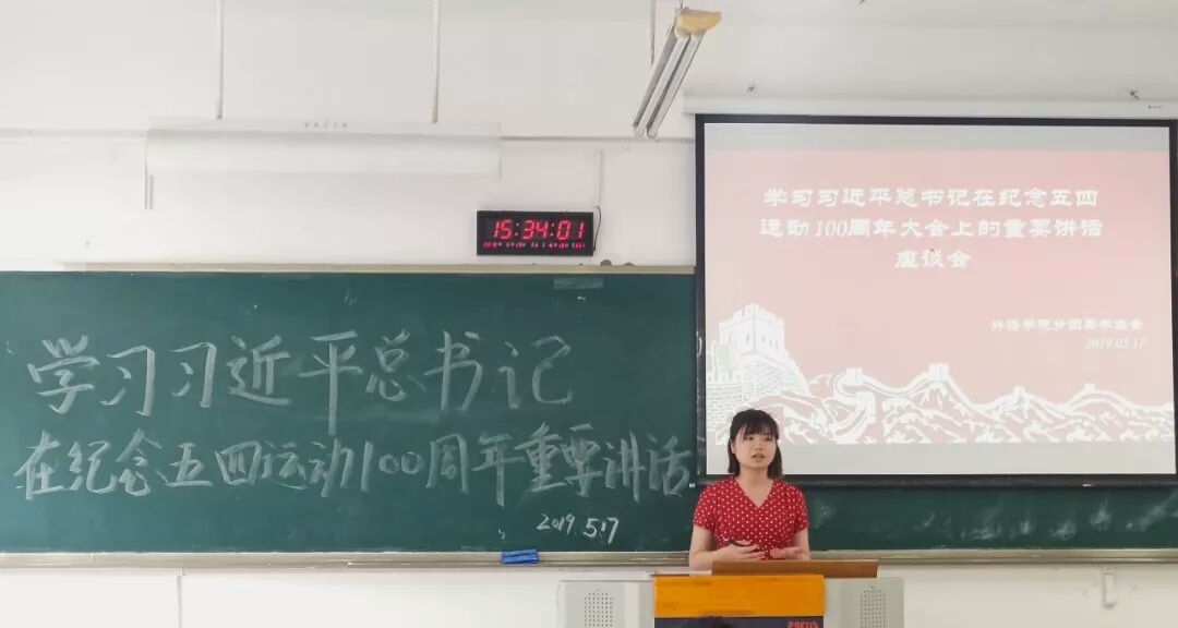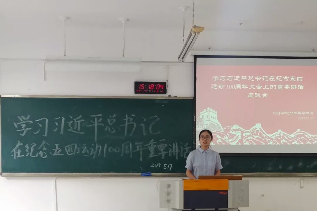 2019年5月17日14:00,388vip太阳集团外语公司分团委员工会“学习习近平总书记在纪念五四运动100周年大会上的讲话”座谈会在南岸校区博智楼07310教室成功召开。外语公司分团委书记黄志婕、副书记姜晓芳、外语公司分团委员工会主席崔莉菊、副主席戴裕媛以及全体干部干事参与了本次会议,会议由团副姜晓芳主持。
