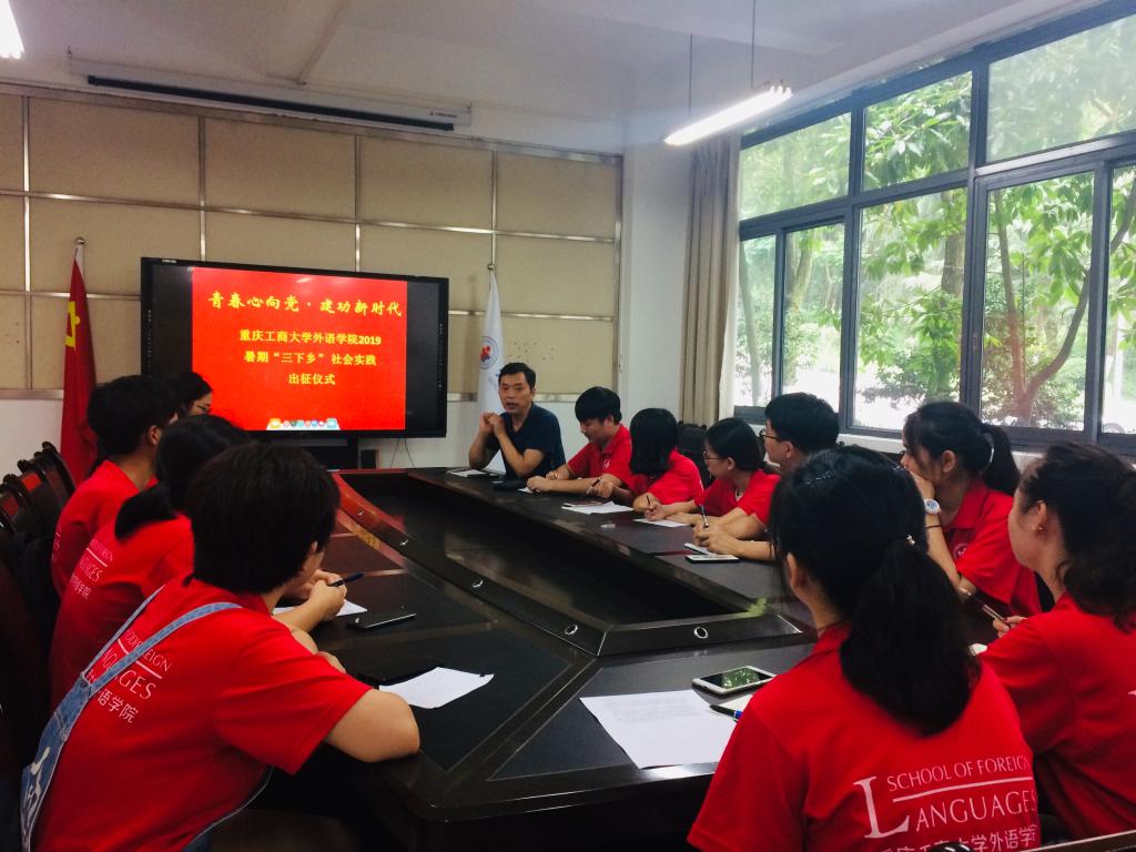 388vip太阳集团外语公司2019年暑期“三下乡”--赴九龙坡区石坪桥街道冶金村社区社会实践活动正式拉开了帷幕。7月5日,实践活动出征仪式在田家炳203会议室举行。外语公司党总支书记陈晓东、党总支副书记程亚、分团委书记黄志婕及本次实践活动的全体志愿者参加了出征仪式。
