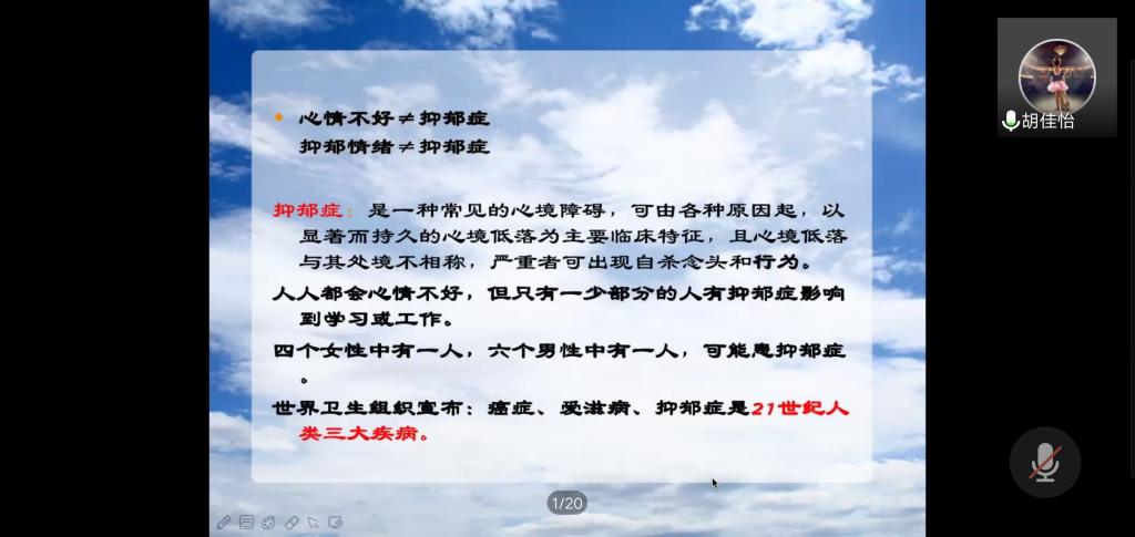 本次活动采取线上直播方式进行。首先,胡佳怡老师根据多年工作经验,指出了老员工常见的七种心理问题:强迫症、广场恐惧症、厌食症、性别认同障碍、多重人格障碍、嗜睡症、抑郁症,特别对抑郁症进行了详细的讲解,教会家长如何识别抑郁症,如何科学认识和处理孩子的抑郁症。之后,家长们积极参与交流,胡老师也对员工家长提出的问题进行了一一解答。