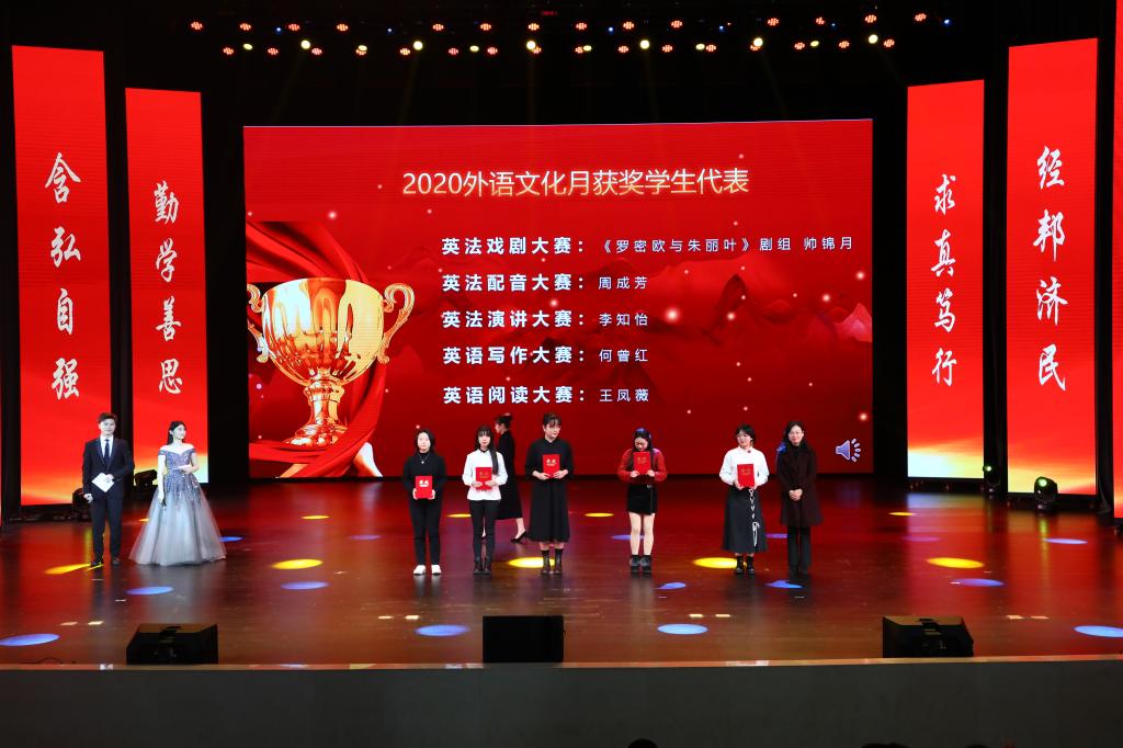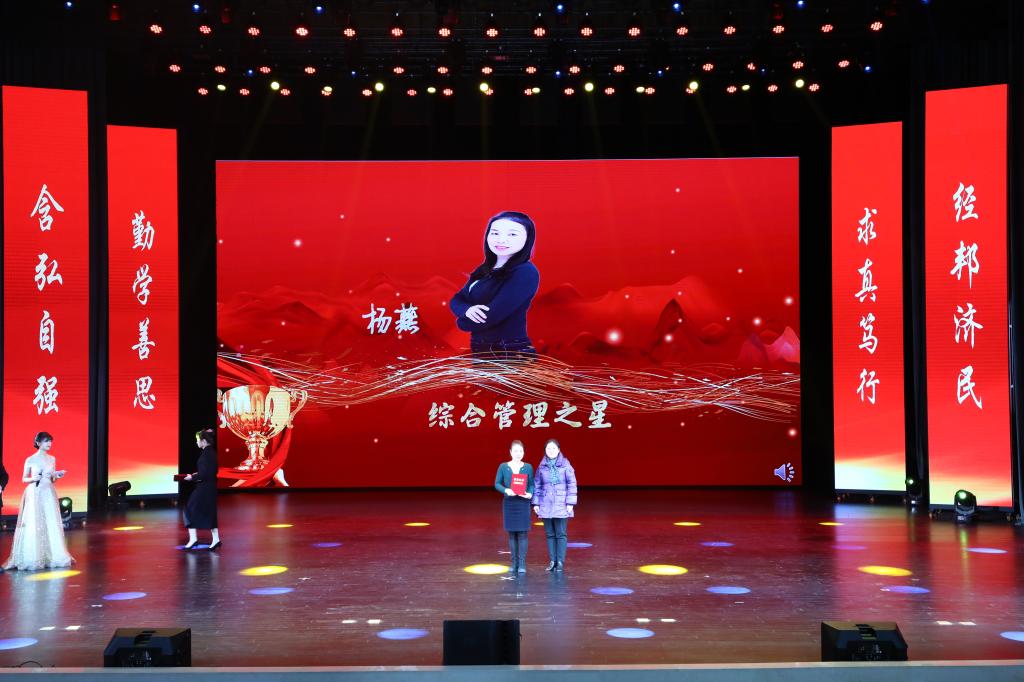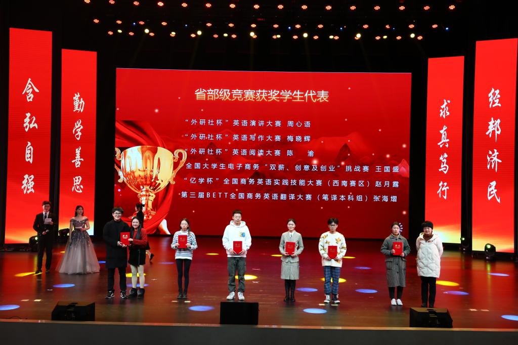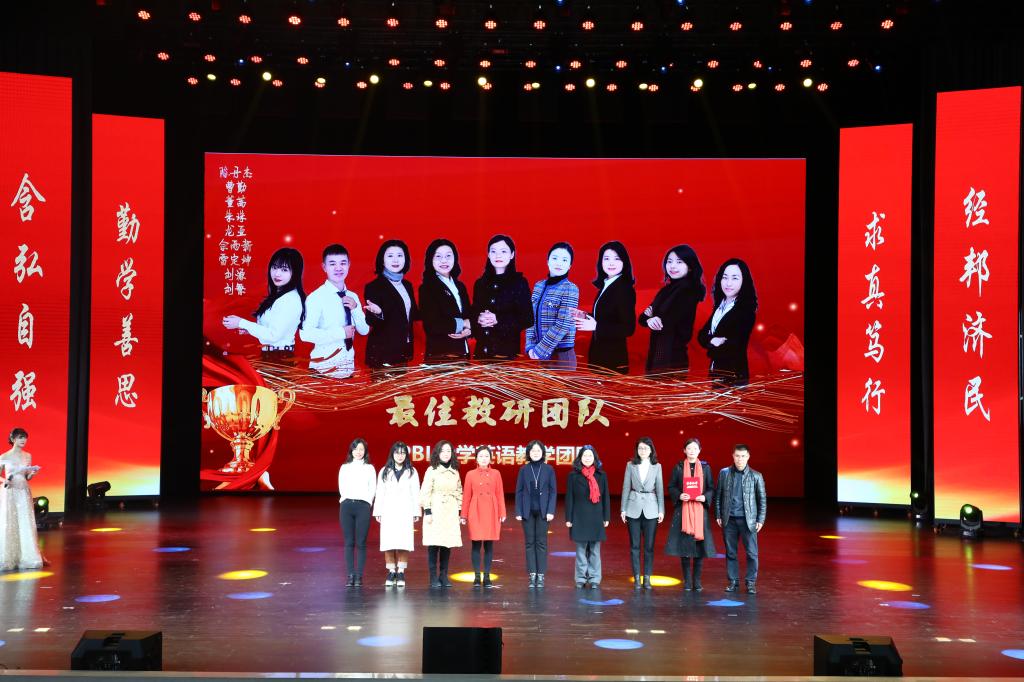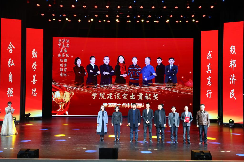 在教师颁奖环节中,李志雄为公司建设突出贡献奖“翻译硕士点申报团队”颁奖,李国军为公司最佳教研团队“综合商务英语教学团队”颁奖,李敬为最佳教研团队“PBL大学英语教学团队”颁奖,申卫东为公司“最美辅导员”丁亮老师颁奖,骆东奇为公司“教学之星”史凤晓、钱圆圆、蒋婧老师颁奖,钟增胜为公司“实践教学之星”王佳、邹莉老师颁奖,杨娟为公司“科研之星”向鹏、罗志高、朱红梅老师颁奖,于频为公司“综合管理之星”杨燕老师颁奖,张轶为公司工会活动之星“啦啦操团队”颁奖。