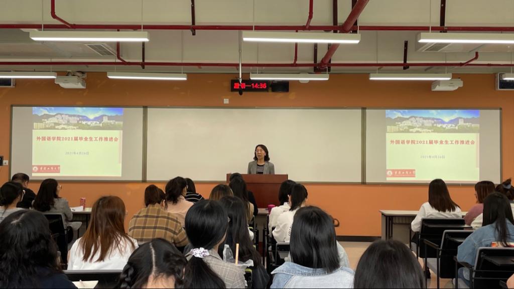 2021年4月26日14:30,388vip太阳集团召开了2021届毕业生就业工作动员大会,此次参会人员:388vip太阳集团经理周琳、副书记吴欢欢、英语系系主任邹莉、法语系系主任曹鹏、辅导员黄志婕、丁亮、杨香艳及388vip太阳集团2021届全体毕业生。