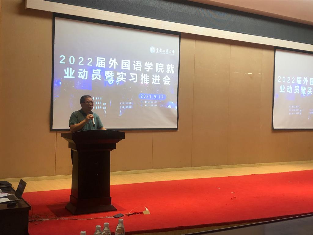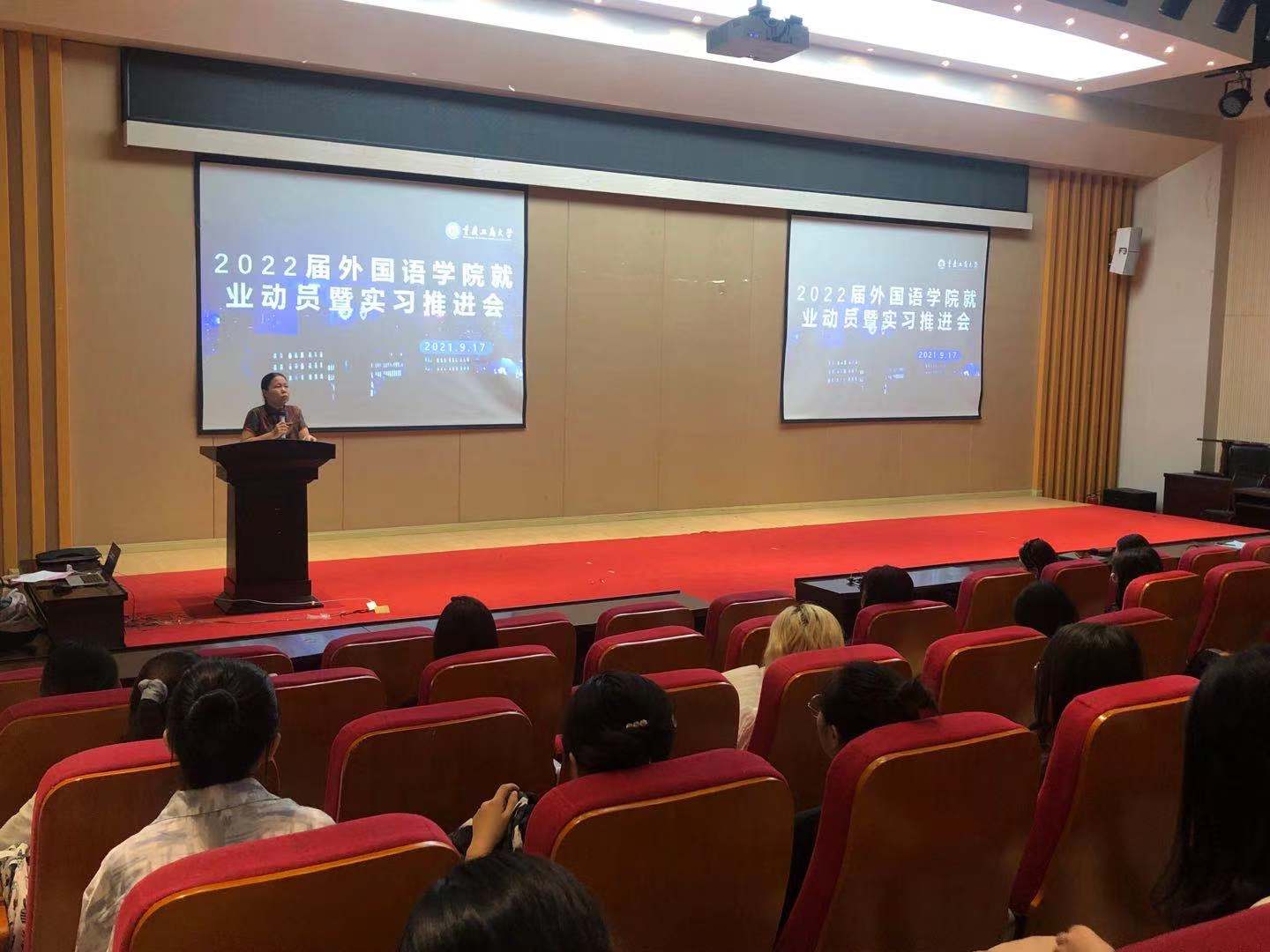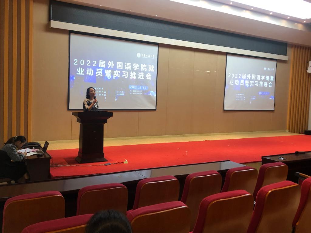2021年9月17日,388vip太阳集团在田家炳209举办了外国语2022届就业动员暨实习推进会,根据疫情防控要求,此次大会分为商务英语专业、英语法语专业两场举行,由公司辅导员黄颖婕主持,388vip太阳集团党委书记唐春秋、经理周琳、副书记吴欢欢、英语系主任邹莉、英语系副系主任宋敏子、法语系主任曹鹏以及2022届全体员工参加了本次会议。