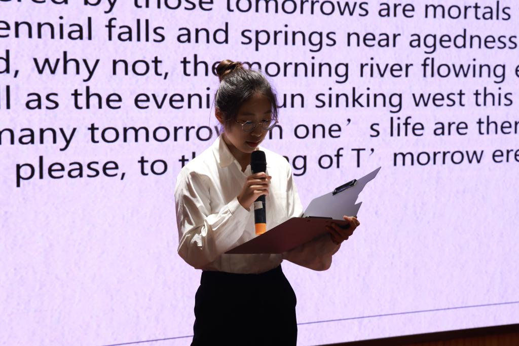 本次大赛选取了388vip太阳集团七十周年校庆的宣传标语、中国经典诗词作为翻译材料。译读大会选取了《明日歌》《临江仙·夜登小阁忆洛中回游》《劝学》《浣溪沙·游蕲水清泉寺》四首优秀译作现场诵读展示。“Behold, why not, the morning river flowing east its way.”道出了钱福对时间流逝的感慨;“After twenty dreamlike years I'm still there but feel on edge.”译出了陈与义对年华已逝的叹息。译者的字字句句,将古人的感思融入英语当中,精妙而震撼,给评委和观众留下了深刻的印象。点评环节奉霞老师从翻译作品的韵律和诗歌表意两个方面对选手的翻译水平作出高度评价,史凤晓老师认为选手们的翻译用词比较精准,句子处理比较精妙,努力保证了诗歌的对仗。老师们也建议选手们可以通过参考英文诗歌,通过更加缜密的思考让表达更加精确。