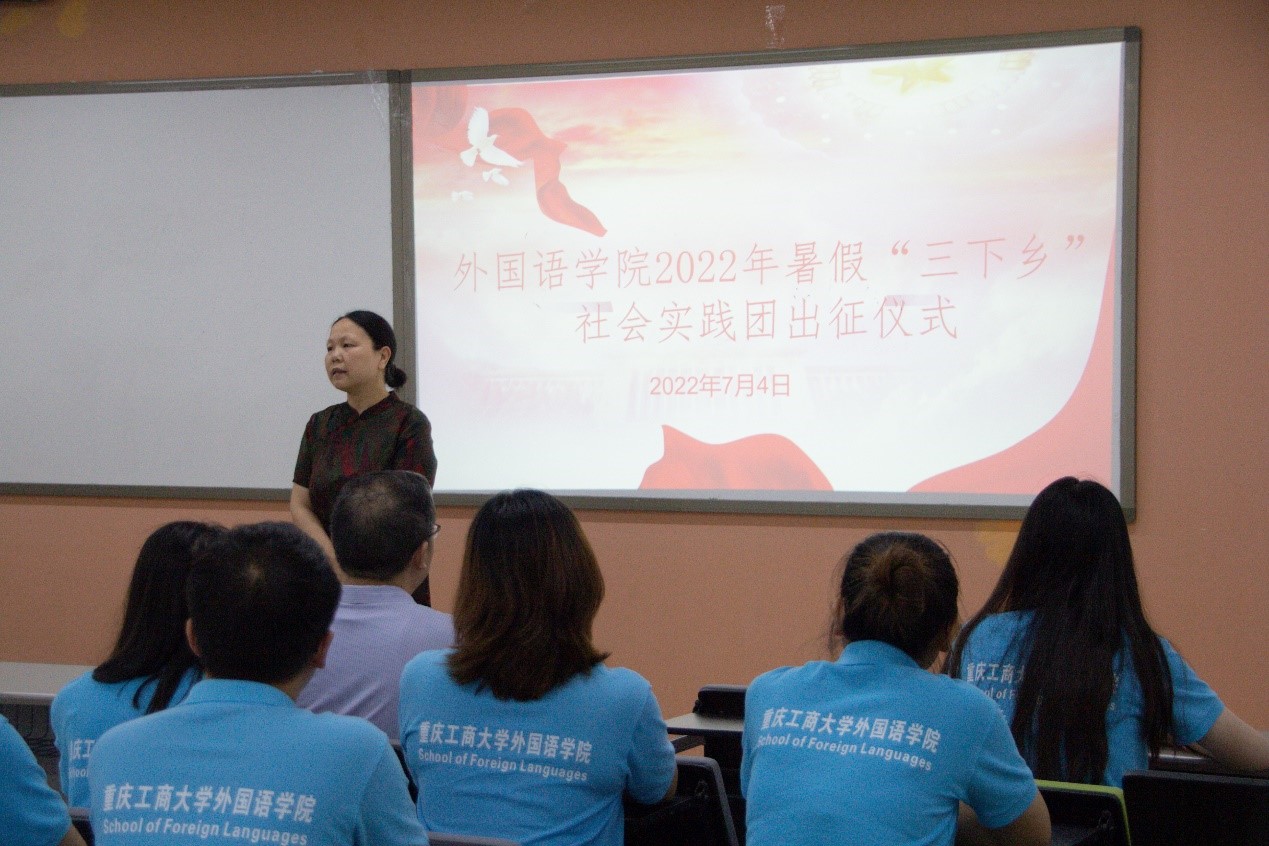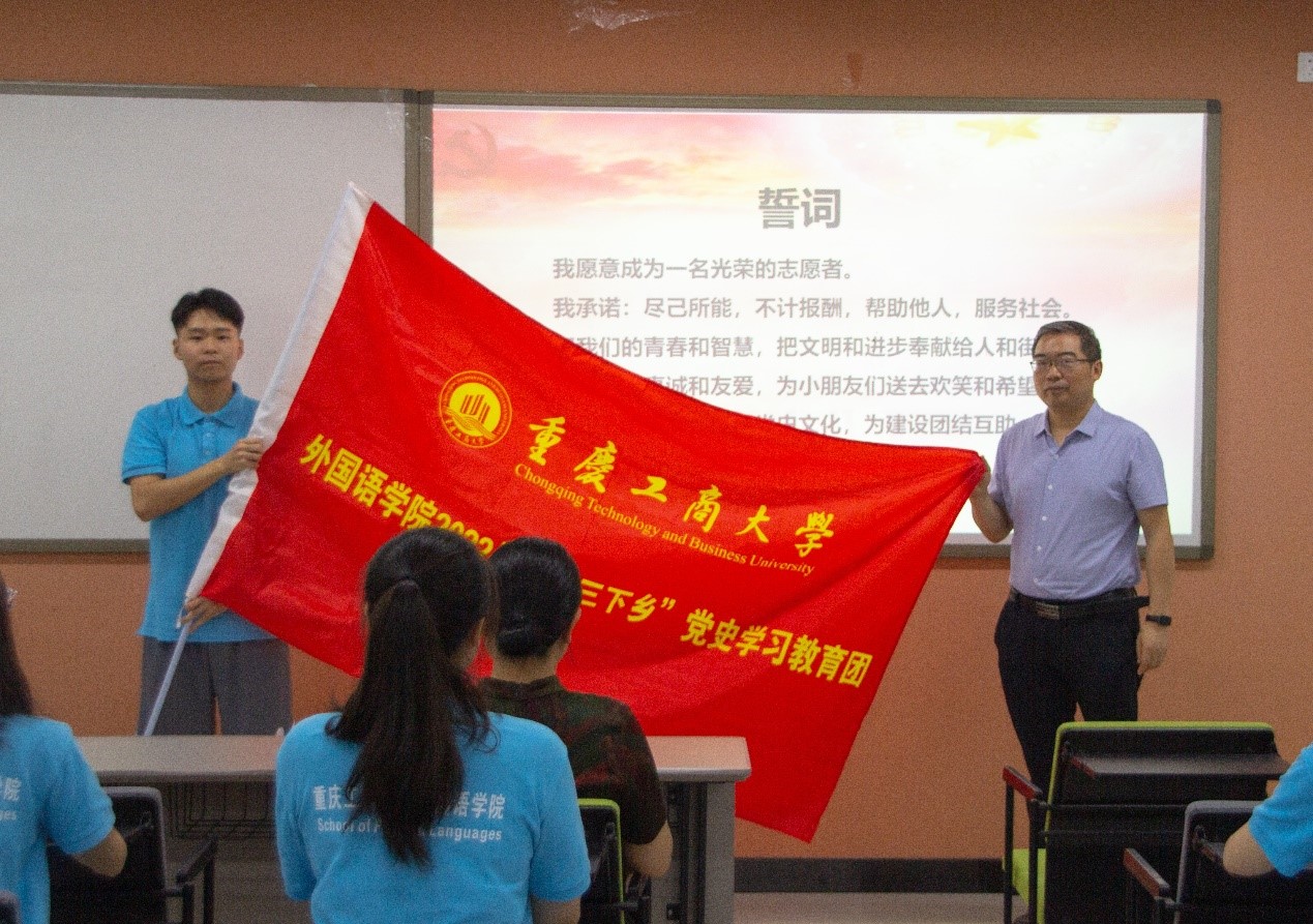 吴欢欢为出征仪式致辞,她指出暑期“三下乡”社会实践活动是青年成长成才的重要载体,是青年了解社会的重要途径,强调了本次实践活动的目的,明确了安全和要求,对实践团成员提出了殷切的希望,希望实践团在实践活动中严肃纪律、吃苦耐劳、互帮互助、乐于奉献。实践团成员刘丝夏代表实践团发言,她紧紧围绕“青春向党践初心,外院青年在路上”党史学习教育的实践主题对本次实践活动的内容做出了详细介绍并对实践期间的相关纪律做出了庄严承诺。实践团全体成员重温志愿者誓词,承诺用青春和智慧践行志愿精神,积极学习宣传党史知识,传承红色基因,为迎接党的二十大的顺利召开奉献青年力量。出征仪式最后,唐春秋为实践团授旗,预祝青年志愿者们安全、顺利、圆满地完成此次“三下乡”社会实践活动。