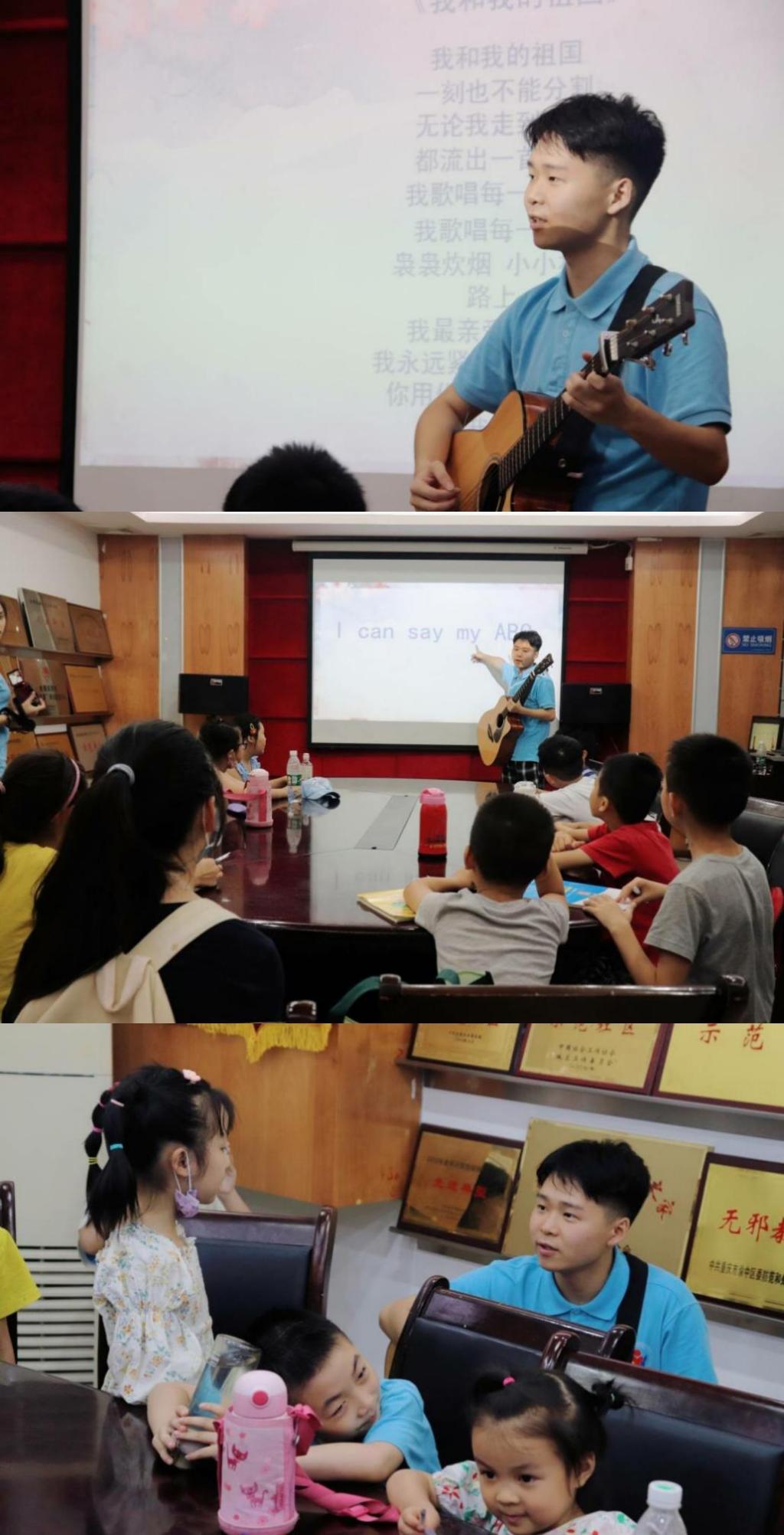 “我和我的祖国,一刻也不能分割……” “A, B, C, D, E, F, G……”婉转悠扬的歌声从教室里传出,实践团成员用吉他弹唱的方式教小朋友们吟唱《我和我的祖国》以及英语字母歌,用音乐的方式激发小朋友们的爱国意识及英语学习兴趣。