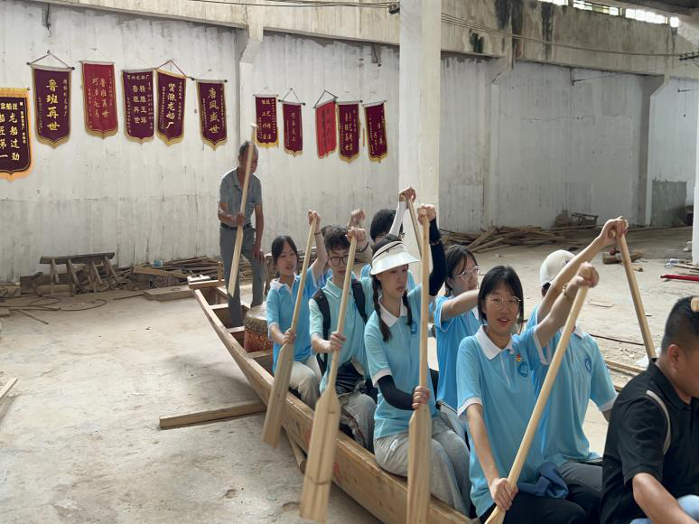图为志愿服务队在李师傅的指导下体验划龙舟