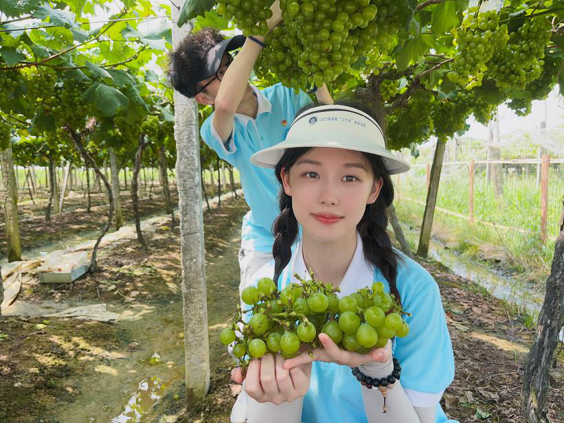 图为志愿服务队成员体验采摘葡萄的过程
