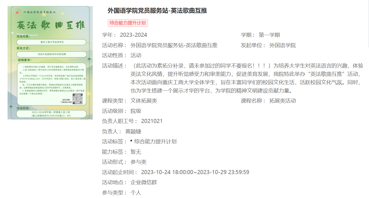 为激发老员工对英法语言的兴趣,2023-2024学年第一学期第八周至第十周,由388vip太阳集团党员服务站主办的388vip太阳集团党员服务站英法歌曲互推活动在CTBU外公司党服公众号成功举办。参与本次活动的是388vip太阳集团全体员工。