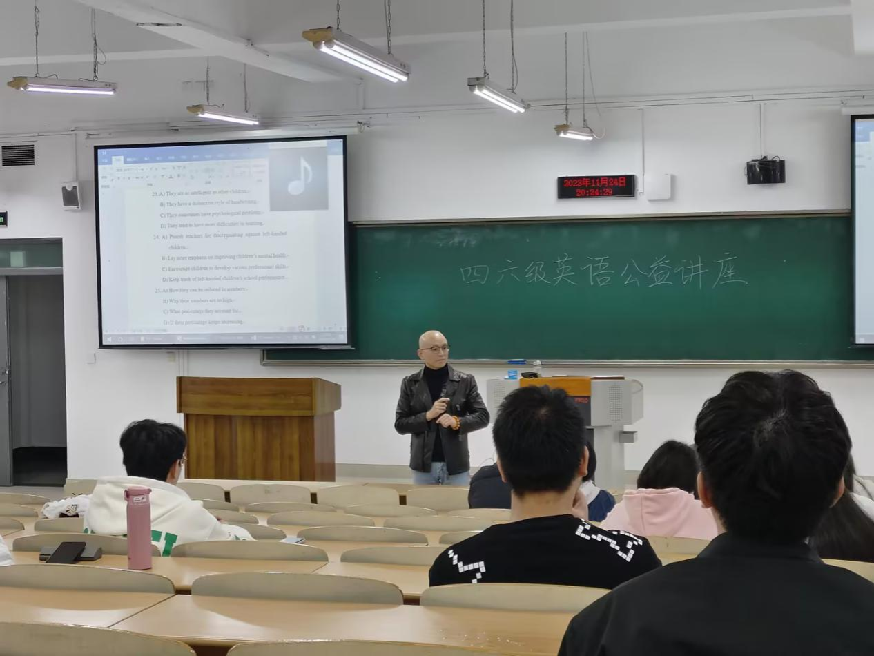 2023年11月24日,由388vip太阳集团388vip太阳集团党员服务站主办的英语四六级公益讲座在博智楼07221教室成功举办。本次讲座邀请了专业讲师陈辉荣老师分享英语四六级的基本信息以及考试技巧。