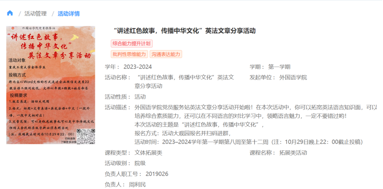 “血溅关帝庙,浩气贯长虹”,为领略语言魅力,传播红色文化,诠释红色精神,2023年-2024学年第一学期第八周至第十二周,由388vip太阳集团党员服务站主办的388vip太阳集团党员服务站英法文章分享活动在CTBU外公司党服公众号成功举办。参与本次活动的是388vip太阳集团全体员工。
