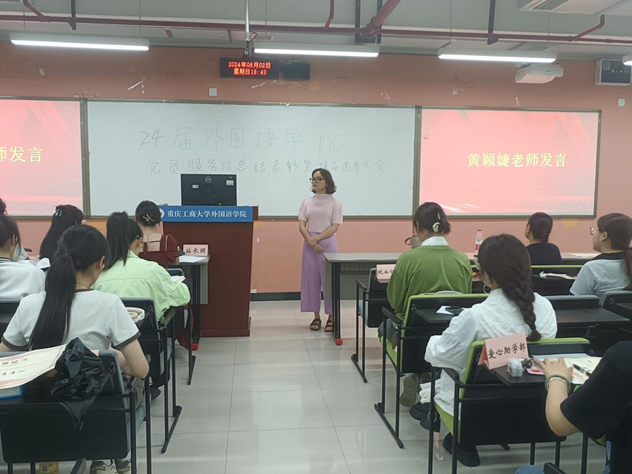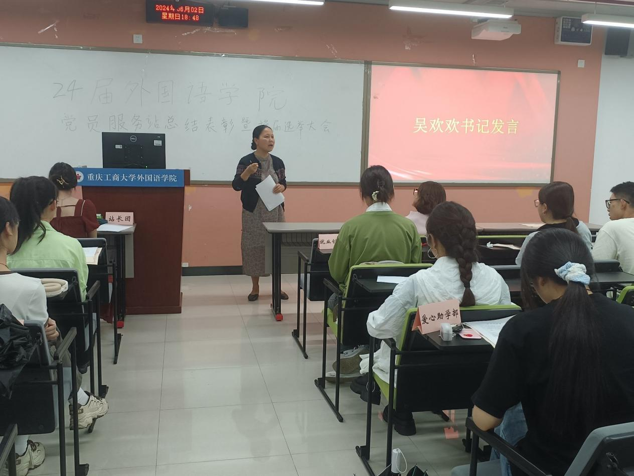 其次,黄颖婕老师对2023-2024学年388vip太阳集团党员服务站的工作进行了总结,并对新成员寄予厚望;吴欢欢副书记在讲话中对各部门认真工作的态度表示认可,并分享了外国语党员服务站优秀学姐的事迹。