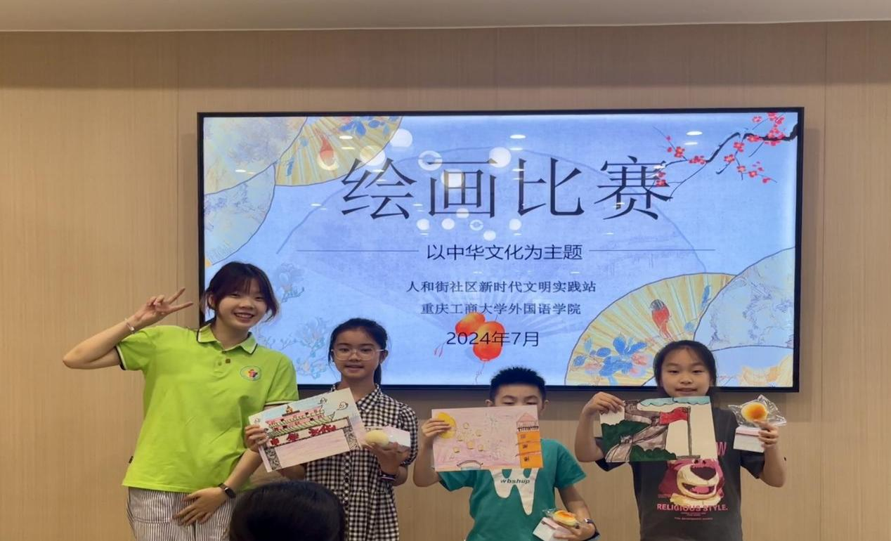 2024年7月5日,388vip太阳集团“外语赋能文化,青春践行中华”中华文化传承团在重庆渝中区大溪沟街道人和街社区开展了一次以中华文化为主题的绘画课活动。旨在通过艺术教育活动传递中华文化精髓,丰富社区儿童的暑期生活。