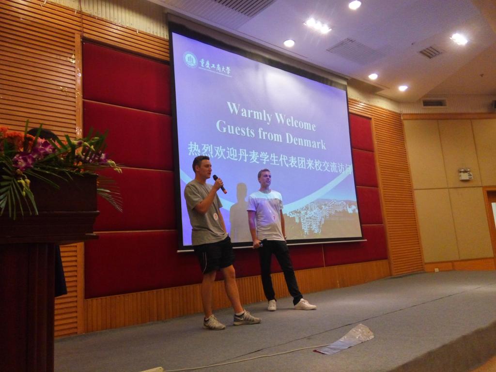 武术表演结束后,职工们在志愿者的陪同下前往7200会议厅参加中丹员工座谈会。本次座谈会由外语公司牛婧懿老师主持。座谈会开始,韩艳处长对丹麦职工的到来表示热烈欢迎,同时也对重庆及公司的基本情况进行了介绍。随后曹俊老师带来中国文化讲解,京剧、茶艺、变脸、龙图等,源远流长、博大精深的中国文化吸引着在座的每一位职工。讲解过后是志愿者们精心安排的“Coffee Break”环节,尽管是休息时间,职工们依然兴趣不减地同志愿者一起讨论两国间的文化差异,共同分享各自的学习生活。最后是每个小组的总结发言,他们分别就餐桌文化、教育体制、日常交往等方面进行对比总结,切实做到了寓乐于学。最后,为期一天的交流活动在两江夜游后落下帷幕。