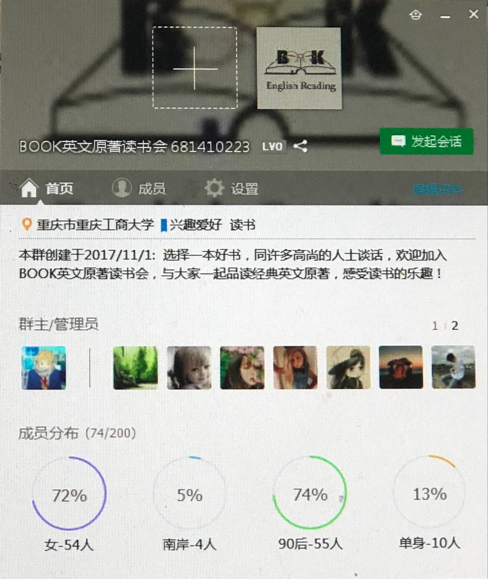 外语公司BOOK英文读书会BrillianceOriginalityOpportunityKnowledge是外语公司打造的一个英语学习、口语练习、英文阅读的读书分享交流平台组织英文读书爱好者坚持1月读1本英文原著,1年读10本英文原著”的英文阅读挑战计划。全校英文读书爱好者通过CTBU外公司党站微信公众号在线报名参加读书会活动主办方公布当期阅读书目后邀请大家加入“BOOK英文原著读书会”线上交流QQ群,参与同学每天通过语音打卡的方式跟进阅读进度,每一期线上阅读完成之后会举办一次线下读书交流会,主办方每期会邀请一位专业教师线上指导大家阅读技巧和参与线下读书分享。