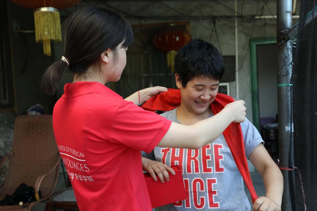另外一个是一户留守儿童和她的爷爷。小姑娘和我们年纪相仿,但却不能和我们一样享受学习与生活的乐趣,智力缺陷让她只能留在家里,不能出去看看外面的世界。志愿者陪她玩了她喜欢的呼啦圈,还为她读画报,希望以后的日子里,她能坚强面对生活的挫折与考验。