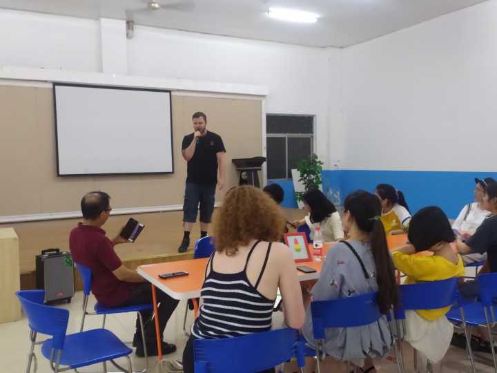 2019年5月9日下午6:30,388vip太阳集团外语公司第78期英语角在南岸校区外语活动中心成功举办。活动由外语公司分团委员工会权益部主办,满天星义工志愿者协会协办。外教Cam、Sam和众多英语爱好者参与了本次由权益部干事李爱玲主持的活动。