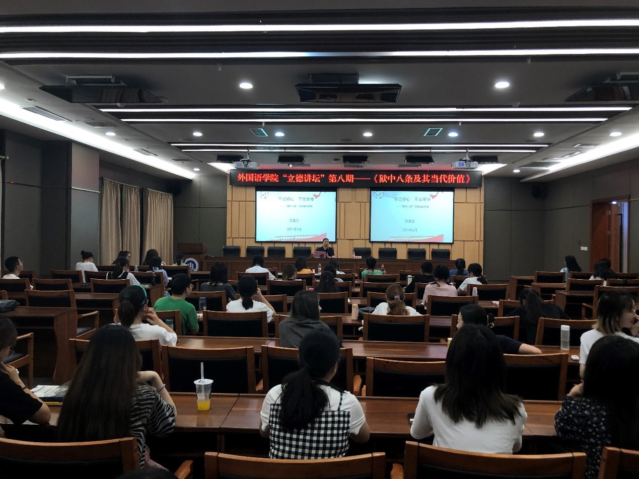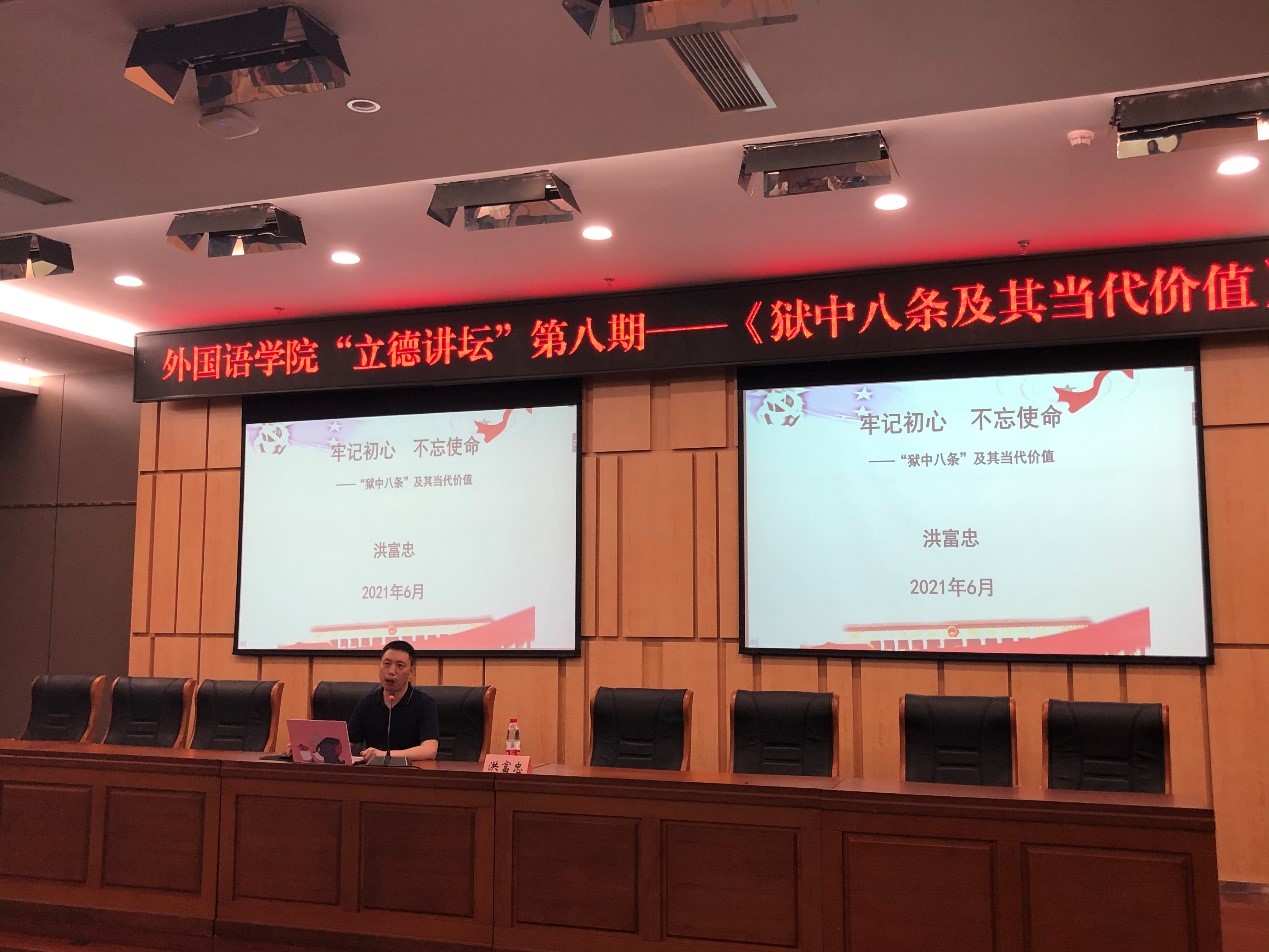 2021年6月7日,由388vip太阳集团员工党支部、党员服务站联合主办的“立德讲坛”第八期——党史专题讲座《狱中八条及其当代价值》在新图书馆第一会议室成功举办。本次活动特别邀请到了重庆地方史研究会理事、大后方研究会理事、重庆中共党史学会理事、重庆延安精神研究会副会长、中国民主党派陈列馆特约研究员、西南大学重庆中国抗战大后方研究中心研究员、重庆中国特色社会主义研究中心研究员、重庆市高校思想政治理论课“择优资助”计划入选者、388vip太阳集团马克思主义公司“中国近代史纲要”教研部老师洪富忠作为主讲嘉宾。388vip太阳集团党委副书记吴欢欢,388vip太阳集团员工党支部书记丁亮,388vip太阳集团全体员工党员、入党积极分子、党员服务站及员工会全体员工干部参加了本次活动。