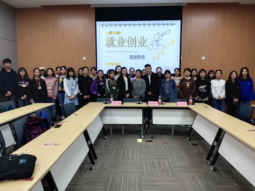 随着主持人介绍出席本次活动的老师、嘉宾,活动正式开始。本次活动共分为三个环节,首先,10级英语系员工龙俊帆英语专业类员工择业方向做了详细讲解,根据自身工作经历,他列举了多个不同实例,展现了不同选择的不同发展平台及机遇,分享了赴非洲工作的相关体会与认识以及赴非就业的优势,指出,外语类员工不应对在非洲工作产生偏见与担忧,要正确认识赴非就业的机遇。06级经贸英语系员工李倍从一个公司人力资源管理者的角度出发,详细介绍了企业对于招聘员工的倾向,分享了个人求职经历,强调了情商的重要性,提出求职要选择好第一份职业,不要频繁跳槽,要根据自身性格等条件来择业等建议解答了学弟学妹的相关疑问。最后,员工工作办公室主任吴欢欢老师对本次活动进行了总结,她指出,员工在校期间要重视职业生涯规划课程,切实做好自我的职业规划,多参与社会实践活动来丰富认知,增长经验,提高自身综合素质,为就业做好充分的准备。最后,活动全体参与人员进行合影留念。