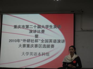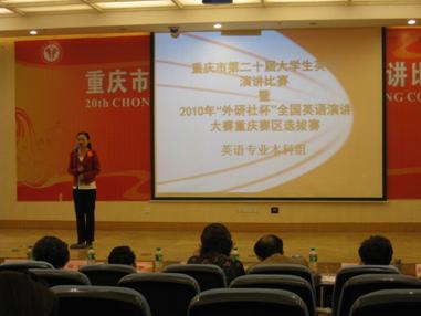 近日,重庆市第二十届老员工英语演讲比赛暨2010年“外研社杯”全国英语演讲大赛重庆赛区选拔赛在西南政法大学举行,来自全市各大高校的90多名选手参加了比赛。公司由外语公司龙亚老师担任领队的代表队参加了大学英语本科组、英语专业本科组、研究生公共英语组、高职高专公共英语组四个组别的比赛,公司外语公司李文英教授、杨玉兰教授还应邀担任了比赛的评委。