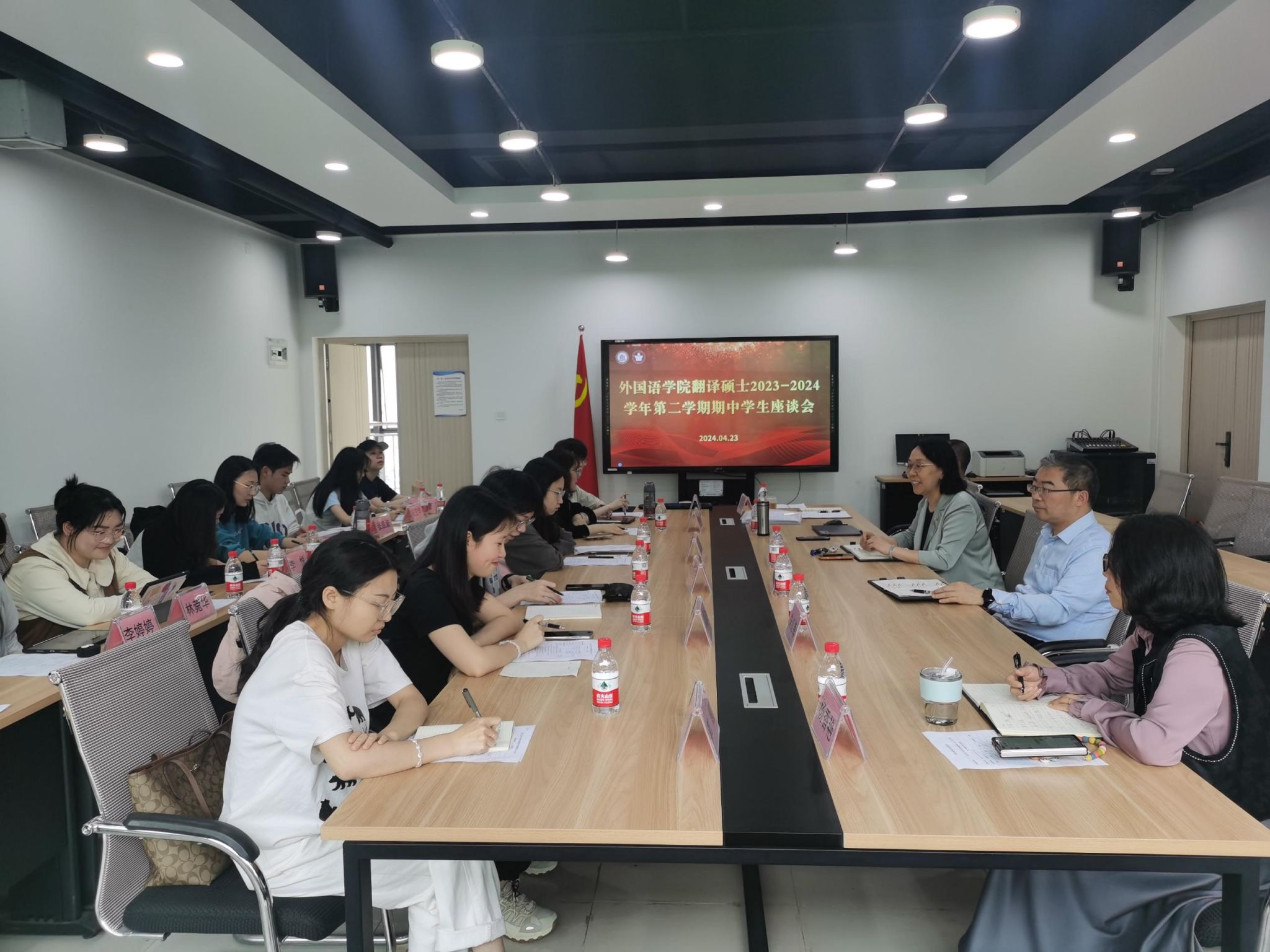 2024年4月23日,388vip太阳集团在涵智楼1216会议室召开了388vip太阳集团英语笔译专业硕士研究生期中座谈会。公司分党委书记唐春秋、经理周琳、研究生导师李洪波、研究生导师朱红梅、研究生辅导员杨香艳、学科秘书金友菊以及388vip太阳集团2023级MTI全体研究生参加,周琳担任主持。